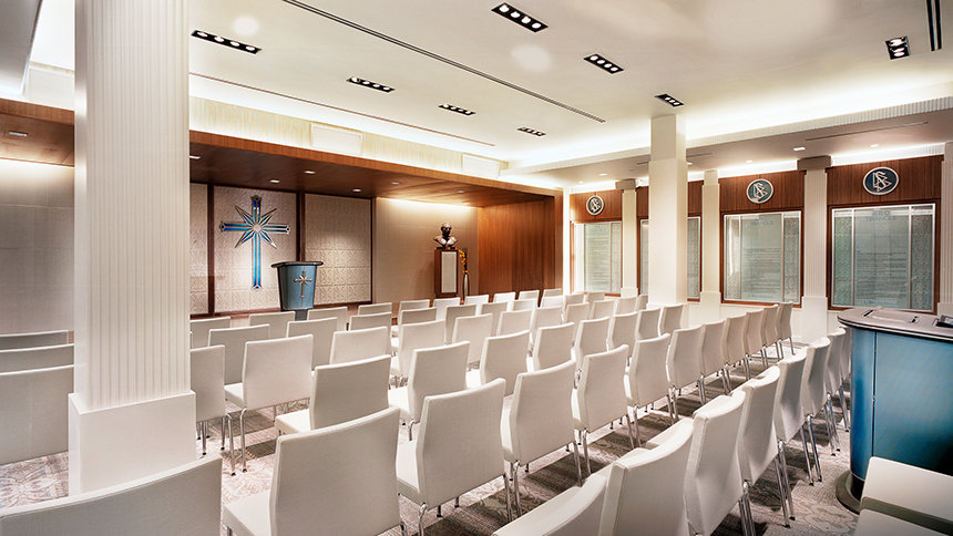 Dette var tidligere en funksjonell bygning – et anneks til sykehuset «Cedars av Libanon» i art deco-stil, som ble bygd i 1928 og ble tegnet av Claud Beelman. Den gjennomgripende gjenoppbygningen begynte i november 2009 og omfatter nye vegger, helt nye tak og overflatebehandling samt møbler fremstilt internt i kirkens høyteknologiske snekkerverksted, med importert tre og marmor fra Italia.
