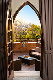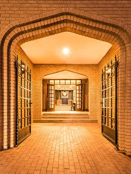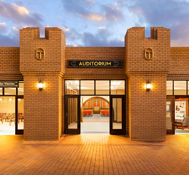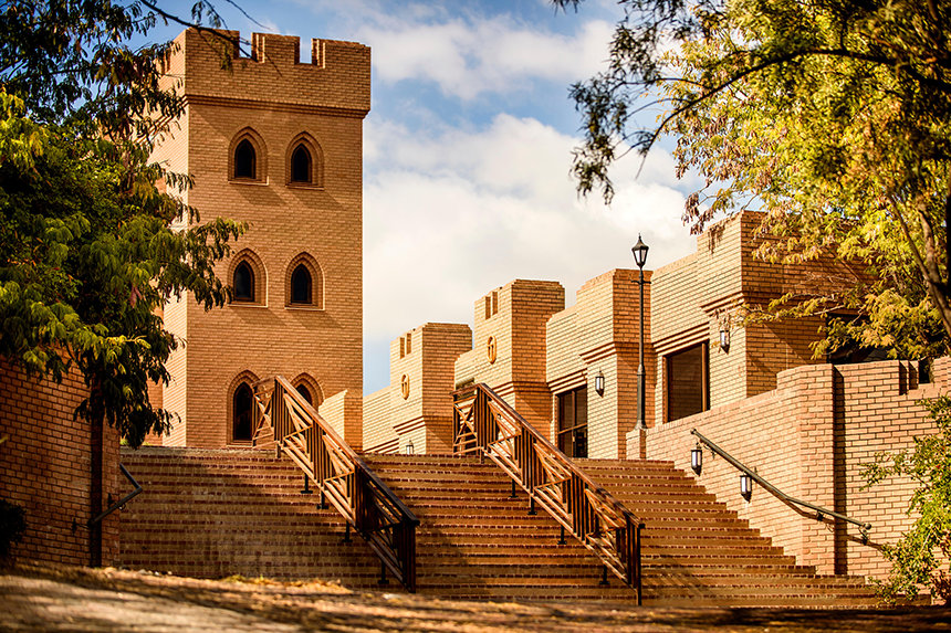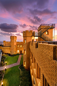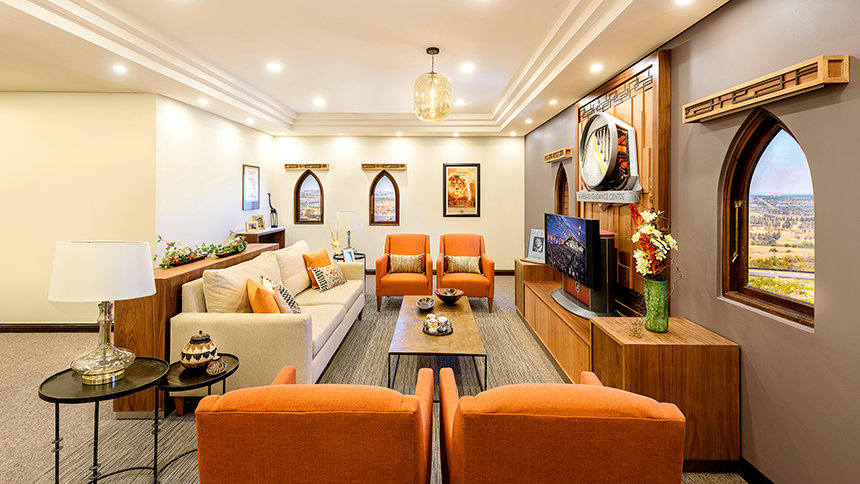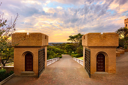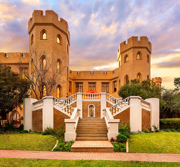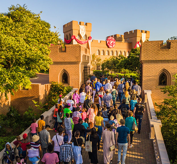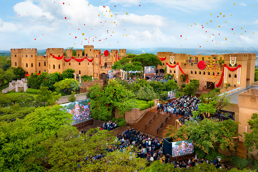 I sentrum av den himmelske bakketoppen, på 88 mål land, står det 8000 kvadratmeter store Castle Kyalami som et vitnesbyrd om religionens forpliktelse til å hjelpe med å skape et Afrika som kan oppfylle sitt ubegrensede potensial. Slottets tilstedeværelse gjenspeiler den magiske aura av det sørafrikanske landskapet der det vender mot nasjonens tvillinggiganter i Gauteng – Johannesburg i sør og Pretoria i nord. Panoramautsikten fengsler raskt de besøkende, og slottets 12 tårn og 20 centimeter tykke vegger gir det en unik stemning. Det elegante interiøret styrket av italiensk marmorgulv, utvunnet fra det samme steinbruddet som ble brukt av Michelangelo, gav sin egen atmosfære til den spektakulære innvielsen.