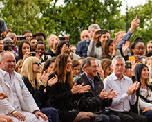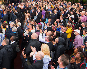 Festlighetene rullet videre da medlemmer fra trioen av Kirker i Gauteng-provinsen fylte Slottets auditorium for en presentasjon av den internasjonale nyttårsfeiringen. Til publikums overraskelse og glede inntok mr. Miscavige scenen i auditoriet og gav dem en uformell oppsummering av ukens eventer. De reiste seg i vill jubel og visste at denne innvielsen ikke bare åpnet dørene til åndelig frihet for scientologer, men gir et løfte om håp og hjelp for hele Afrika.
