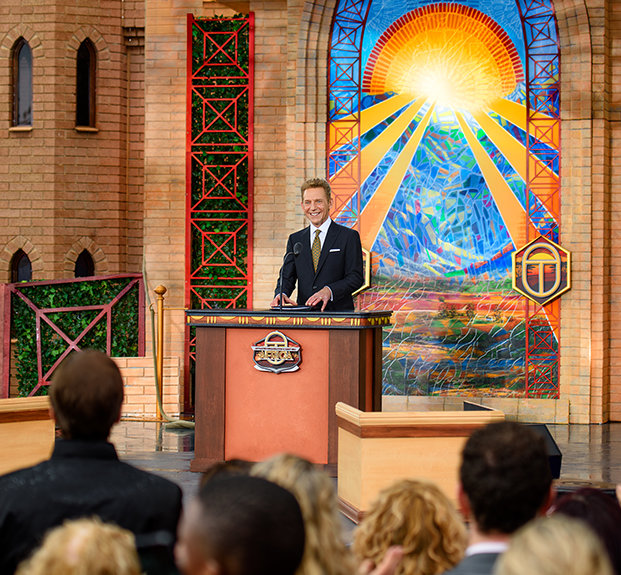 På nyttårsdagen, med fantastisk utsikt fra høyden foran og den forbløffende formen av Castle Kyalami bak seg, stod mr. David Miscavige, kirkelig leder av Scientology religionen, foran de tusener av menneskene som var samlet, og talte om den monumentale naturen av denne enestående innvielsen.
