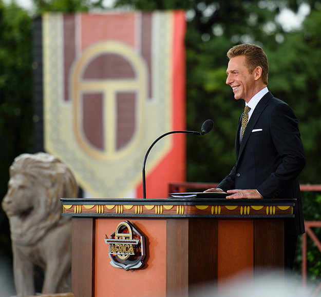 «Når du leser L. Ron Hubbards bøker innser du at vi forandrer verden hvis vi blir frivillige for hans tanker», sa han til publikum. «Jeg vil gjerne si at Dianetics og Scientology representerer ånden av Ubuntu: ’Jeg er fordi vi er.’ Det er ånden som vårt land så desperat trenger. Så i dag, la oss fyre av kanonene og blåse i trompetene. La løvene brøle, elefantene flakke og leopardene løpe, fordi Afrika kaller nå dette utrolige slottet sitt hjem. Og med det har en ny oppvåkning kommet til vårt kjære Afrika!»