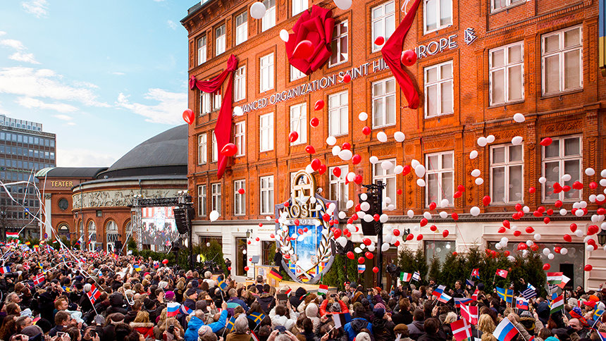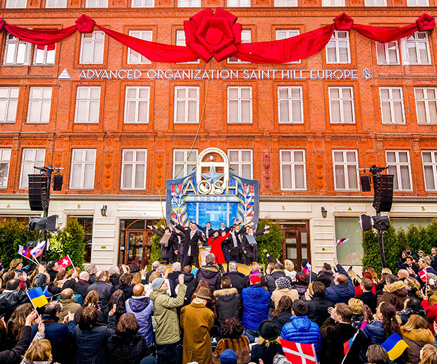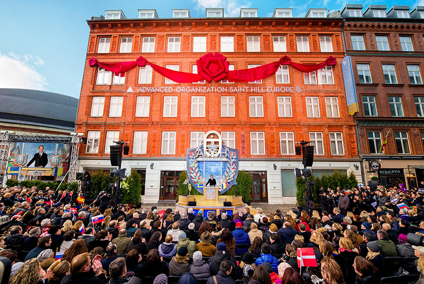 Slik var scenen langs Jernbanegade i København ved innvielsen av den nye ideelle europeiske inngangsporten til OT: Ideell Avansert organisasjon og Saint Hill Europa (AOSH EU).