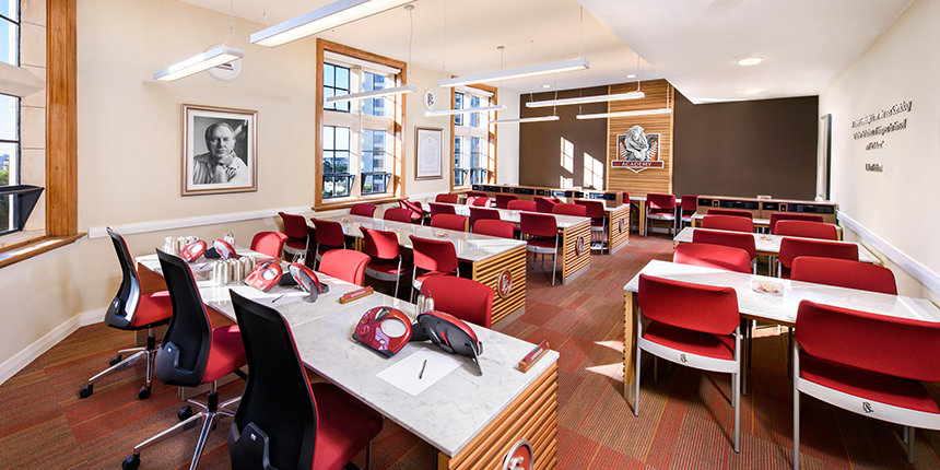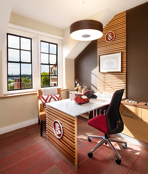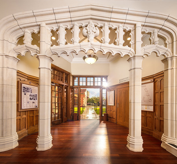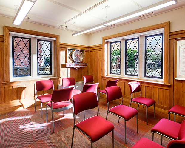 Fra den røde mursteinen og den hvite Oamaru-steinstrukturen som er brukt over hele fasaden, til å restaurere det delikate eiketreverket i inngangshallen og biblioteket, og omsorgen for Rimu-trepanelene og Jarrah-tregulvet, bemerket hun, skiller arbeidet seg ut som et kunstverk i seg selv.