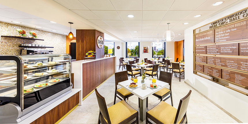 Kaféen tilbyr et møtested for dem som deltar i eventer, og for kirkemedlemmer i pausene mellom Scientology servicer.