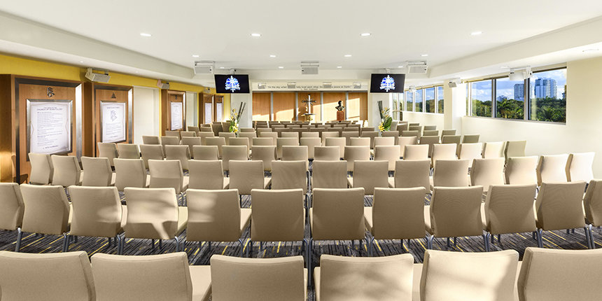 Kapellet i Miamis nye Scientology Kirke er utformet for kirkelige handlinger som omfatter søndagstjenester, brylluper og navngivningsseremonier. Det er også det perfekte stedet for Åpent hus-arrangementer, samfunnsmøter, kommunale brunsjer og banketter for medlemmer av alle trosretninger.