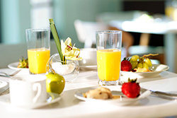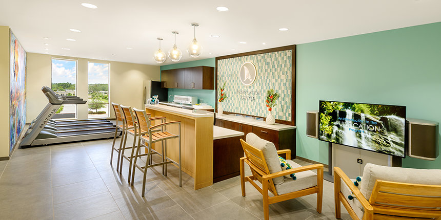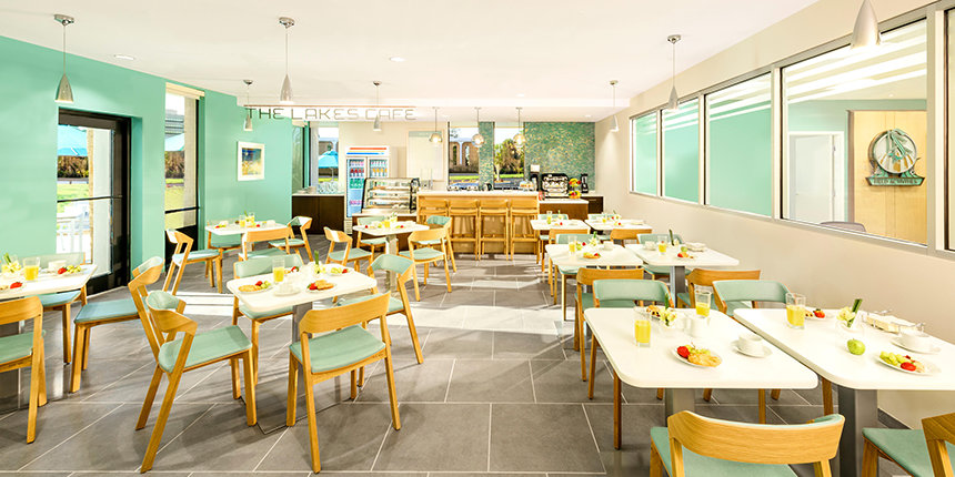 Den elegante Lakes kafé – med både innendørs og utendørs sitteplasser – tilbyr et møtested for dem som deltar i eventer, så vel som for medlemmer i pausene mellom Scientology servicer.