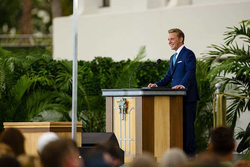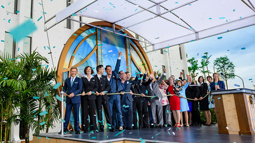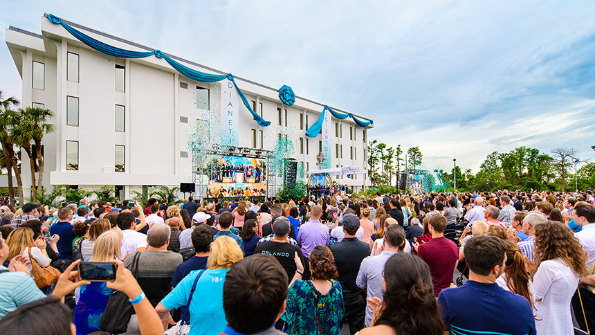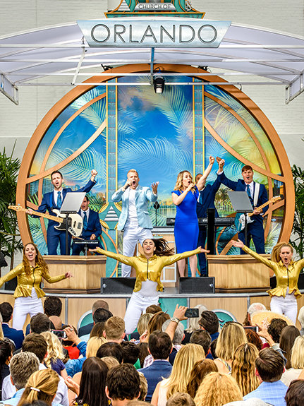 På denne vårettermiddagen spilte orkesteret opp musikk i lystig tempo – et lydspor av innslag fra områdets temaparkmeny smeltet inn i moderne hip-hop. Det var et refreng i harmoni med dignitarer til stede, som hyllet arven til kirken i Orlando og oppfordret medlemmer til å bringe «virkelig magi» til deres lokalsamfunn.