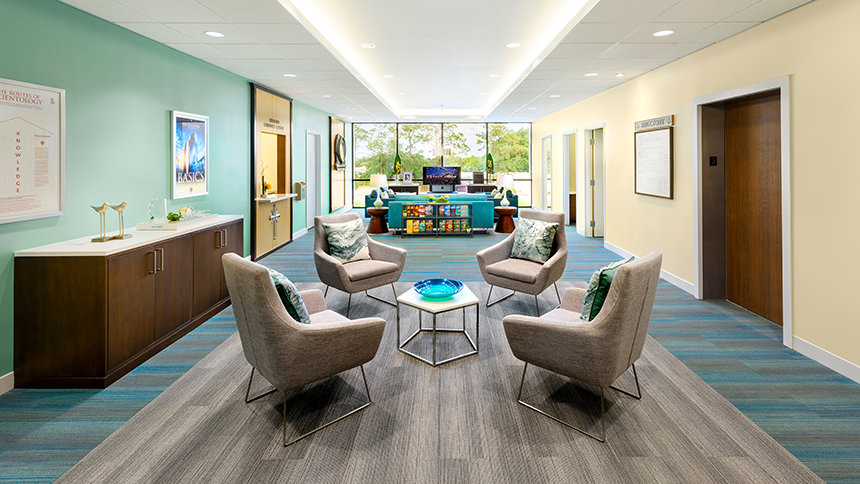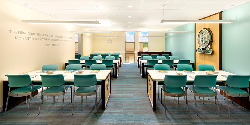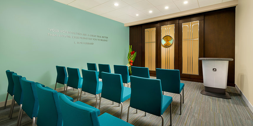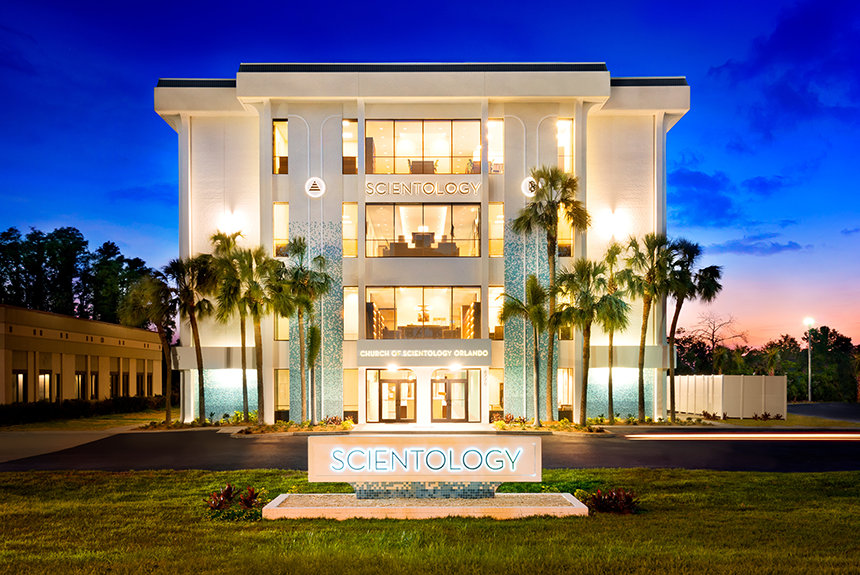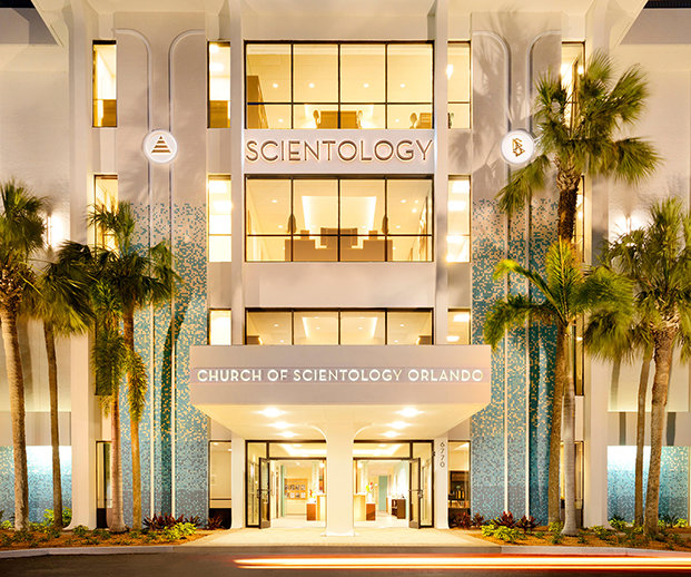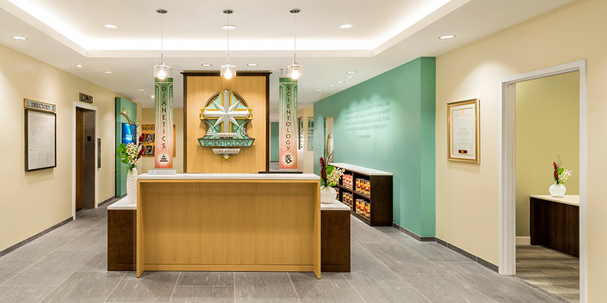 Det første besøkende og menighetsmedlemmer ser når de nærmer seg den nye 4-etasjes Scientology Kirken i Orlando er dens fasade fra midten av 1900-tallet. De besøkende trer inn i et lyst og moderne lokale med anstrøk fra de solfylte Florida-omgivelsene. Lys blågrønn, sandfarger og gråtoner gir en avklaret følelse til Informasjonssenteret som presenterer en introduksjon til Dianetics og Scientology. Det inneholder en utstilling med mer enn 500 filmer på 17 språk som viser Dianetics og Scientologys fundamentale trossetninger og praksiser og forteller om L. Ron Hubbards liv og arv.