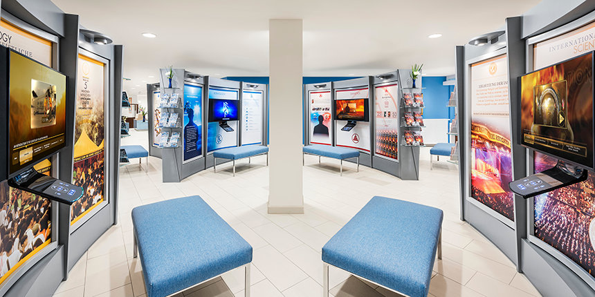 Mens de besøkende går inn Stuttgarts nye Scientology Kirke blir de møtt av en palett av stålblå, krom og gråtoner som avspeiler byens høyteknologiske identitet. Fasilitetens svake aksentfarger sammen med mahogni kombineres til å gi et rolig, innbydende aspekt til Informasjonssenteret som presenterer en introduksjon til Dianetics og Scientology. Det inneholder en utstilling med mer enn 500 filmer på 17 språk som viser Dianetics og Scientologys fundamentale trossetninger og praksiser samt L. Ron Hubbards liv og arv.