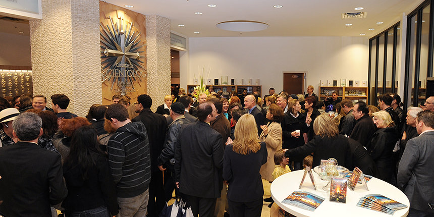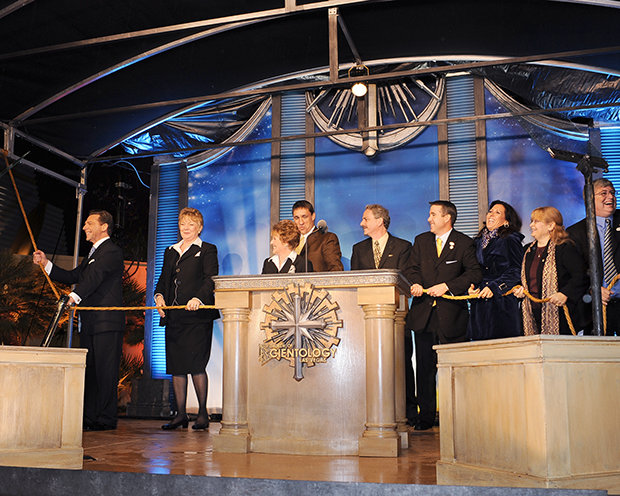 Hjulpet av lokale scientologer som tok initiativet til å bygge den nye kirken, klippet David Miscavige båndet og inviterte alle innenfor.