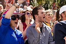En jublende tilskuerskare hyller en innvielse i hovedstaden og feirer Texas-frihet på byens mest populære ferdselsåre, The Drag.