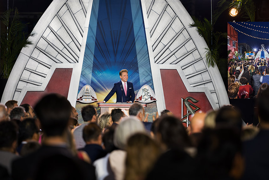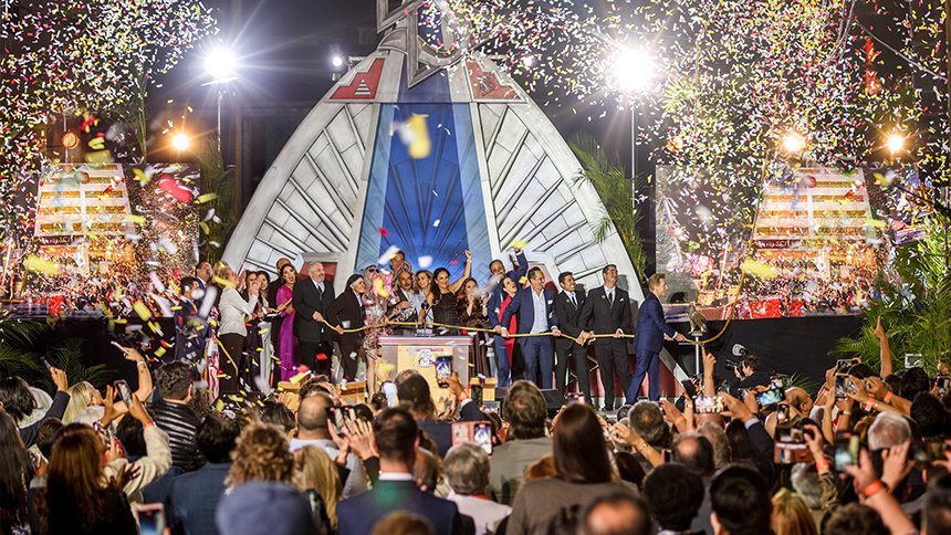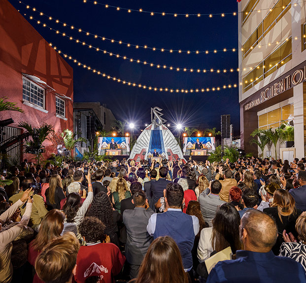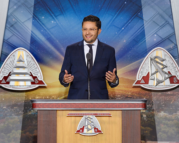 Den emfatiske velkomsten ankom så det forslo da mr. David Miscavige, den kirkelige lederen av religionen Scientology, inntok scenen for å tale til alle tilstedeværende. «Husk at selve essensen og livskraften i en Ideell org er, som vår Grunnlegger så for seg: ’En virksomhet der folk kom for å oppnå frihet, og der de hadde tiltro til at de ville oppnå det.’ Det er hva vi feirer i dag. Det er den gaven dere gir. Og visjonen gjort til virkelighet av dere, heltene i denne bevegelsen, ved å skape denne Ideelle orgen», sa mr. Miscavige. Vil dere se historien som skapes i denne latinamerikanske megabyen? Vel, øyeblikket er kommet – akkurat her og akkurat nå.»