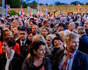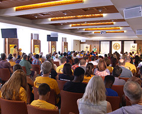 Utenfor portene til Manor, gjennom inngangene og nedover den lange feiende veien til paviljongen og Riddersalen – The Great Hall, til en scene som var reist under dekket av et enormt selskapstelt, fylte medlemmer av Den internasjonale assosiasjonen av scientologer fra mer enn 65 nasjoner luften med ulike språk mens de gikk inn i arenaen med ett formål – å feire deres og hele menneskehetens menneskelighet.
