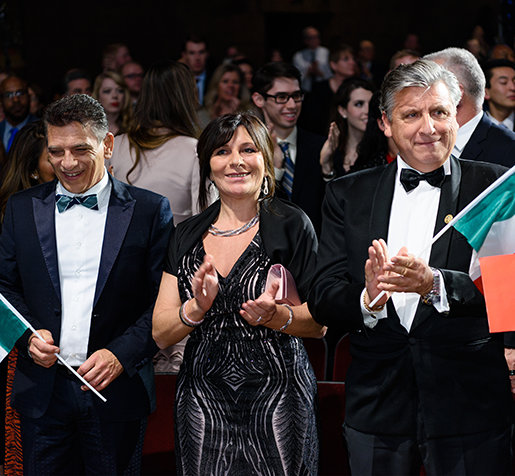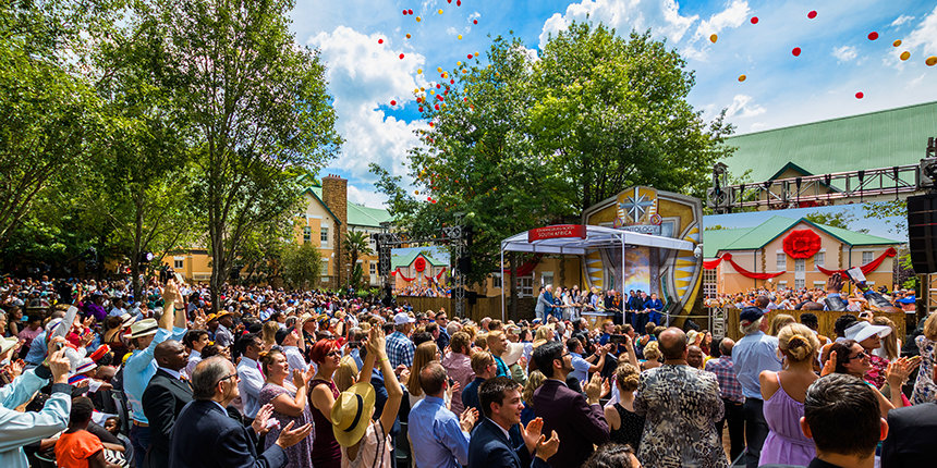 Og akkurat på den måten satte mr. Miscavige scenen for en majestetisk feiring som pulserte med spenning mens visuelle høydepunkter av prestasjoner rullet ut minutt etter minutt. Høyest noensinne etter høyest noensinne prestasjoner understreket et år uten sidestykke. Ytterligere historier fremhevet kirkens berømte internasjonale humanitære innsats så vel som en imponerende gjennomgang av over 46 000 kvadratmeter med nye kirker innviet i det siste året. Gjennomgangen av strålende innvielser i 2017 inkluderer: