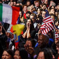 Publikum reiser seg samlet når Mr. David Miscavige, religionen Scientologys kirkelige leder, går inn på den enorme scenen for å ønske alle velkommen til Nyttårsfeiringen.