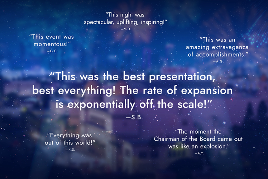 Mens gryningen av det nye årets nærmer seg, nærmer den spennende kvelden seg en gripende avslutning med en inspirerende storslått finale idet Mr. Miscavige leverer sitt avsluttende budskap.