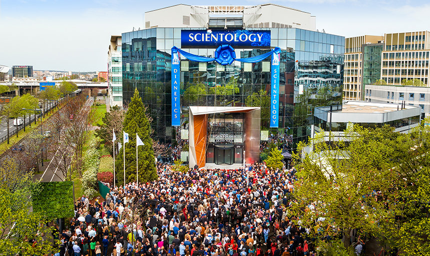 På hvilket tidspunkt de tusener av entusiastiske kirkemedlemmene og nysgjerrige gjester ivrig stimlet frem til Kirkens storslagne inngang. Så, da det gigantiske blå båndet på toppen av den glitrende bygningen dalte ned, fyrverkeri ble skutt opp og flagrebånd fylte luften, ble dørene åpnet på vidt gap og folkeskaren krysset terskelen for å se seg om i dette nye åndelige hjemmet, den utsøkte Ideelle Scientology Kirken og Celebrity Centre Grand Paris, som nå i sannhet er åpen.